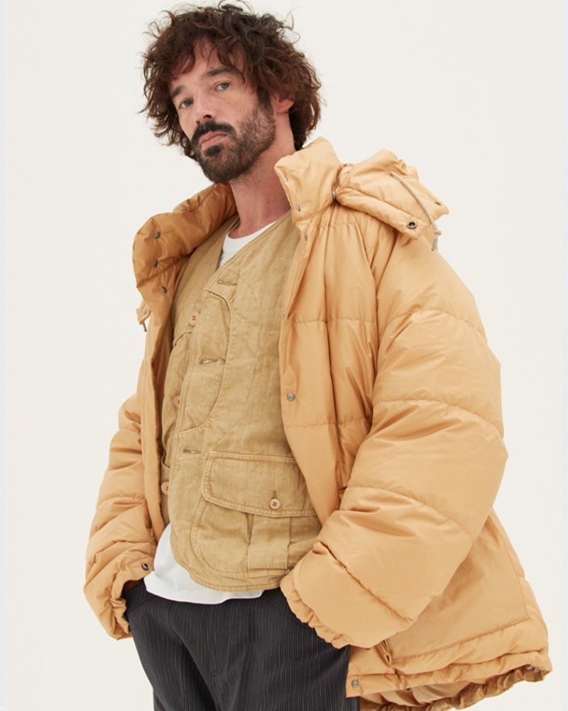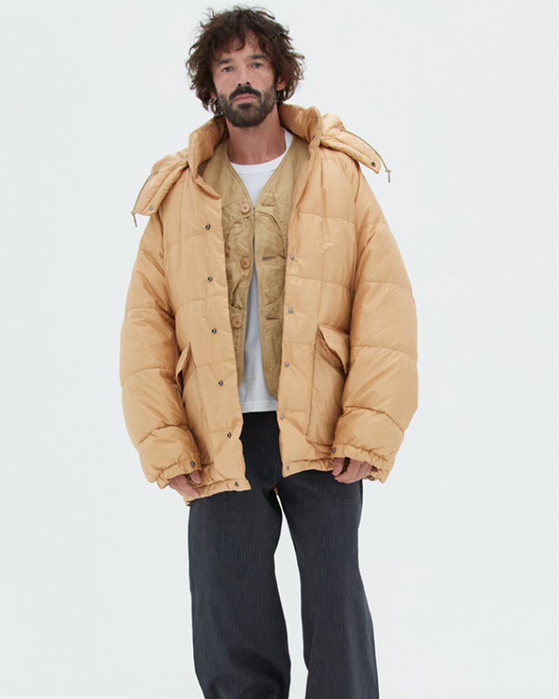 A classic style down jacket in silk fabric, filled with white goose down. Snap button closure, two front pockets, removable hood.