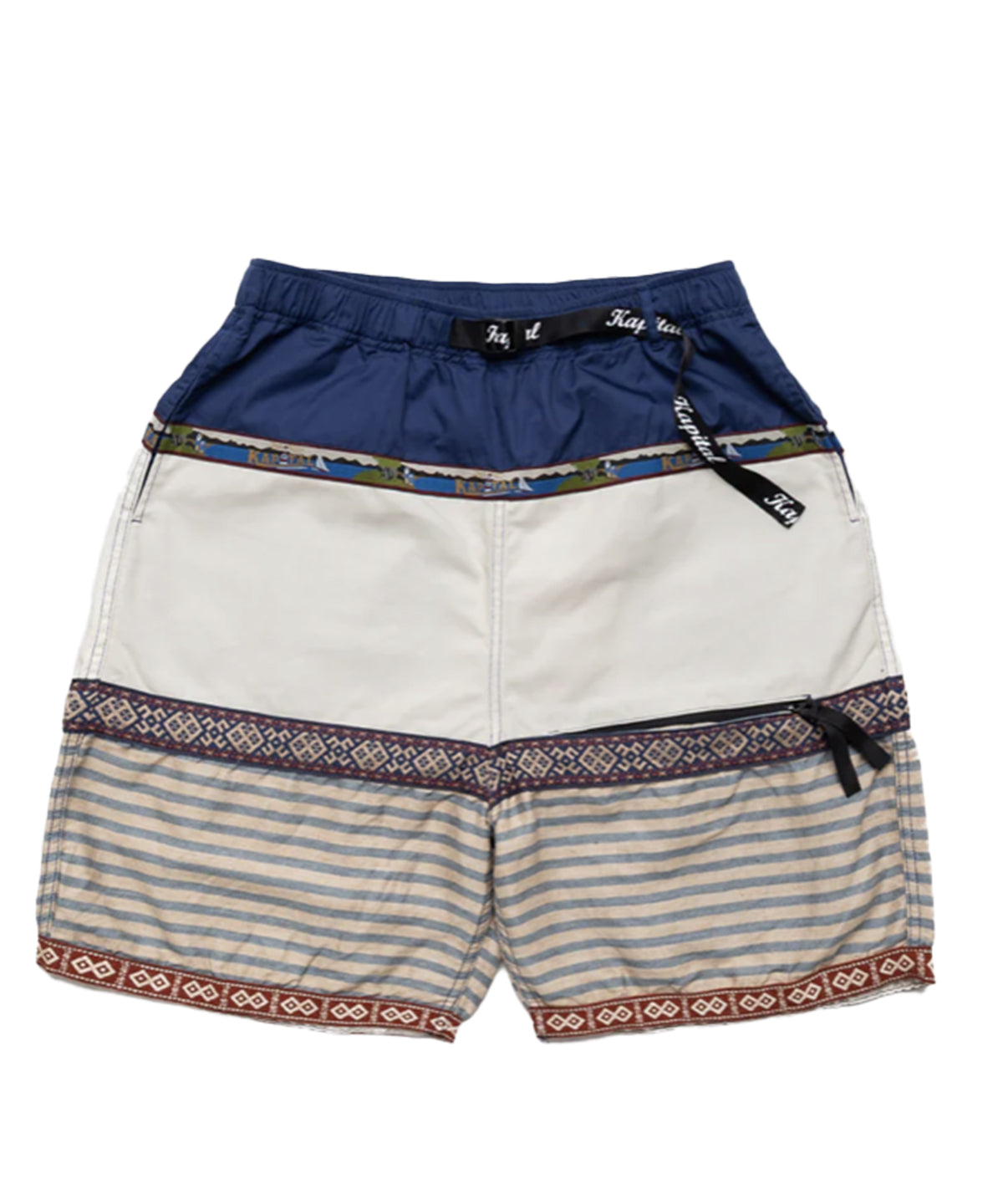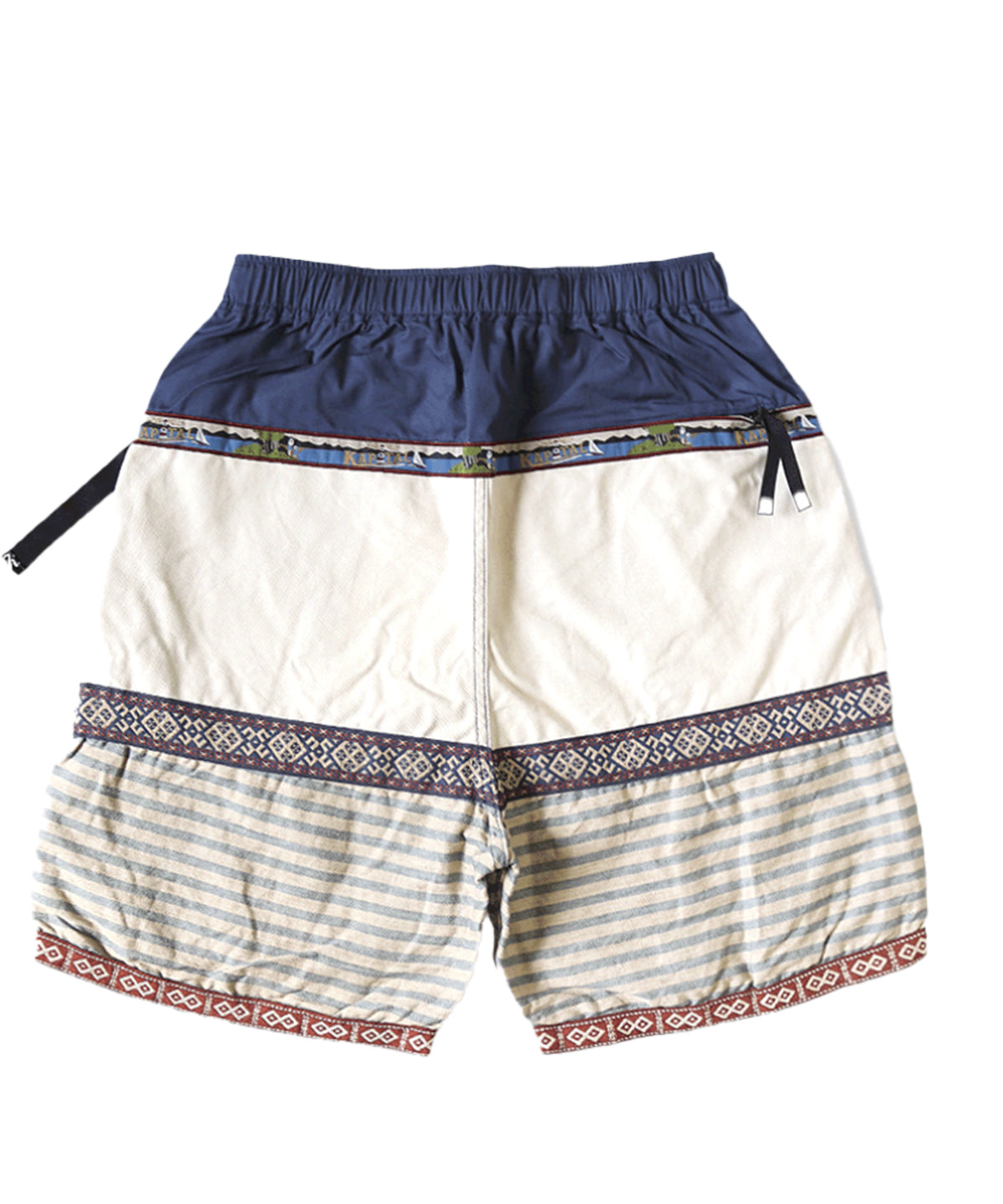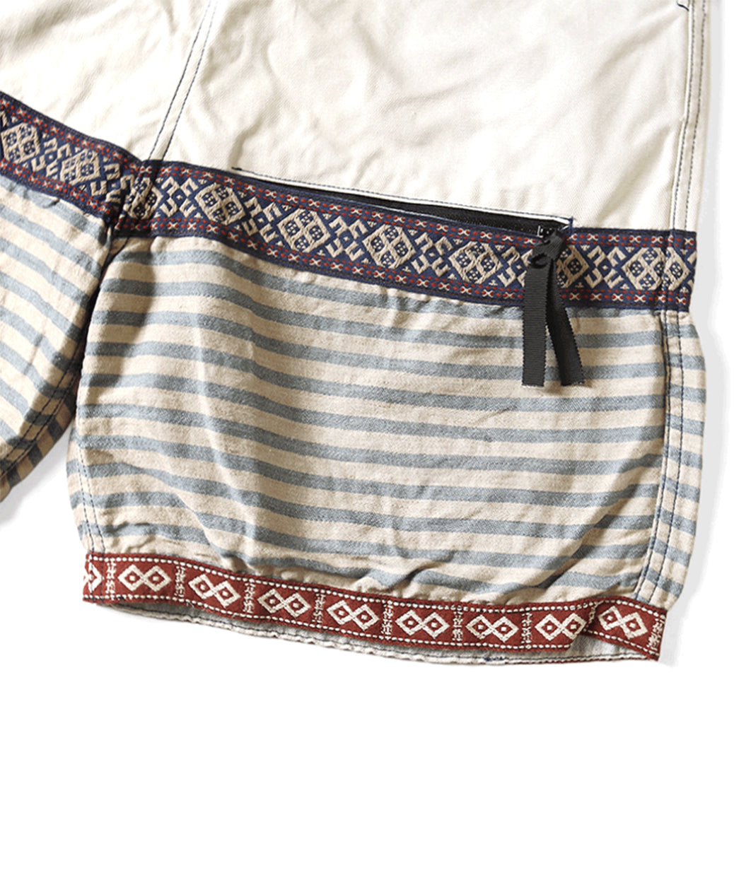 Thin shorts that combine 3 types of fabrics and Tyrolean ribbon. A rubber waistband with an adjuster attached to the front. There are four pockets on the left and right sides, the left thigh and the right back.