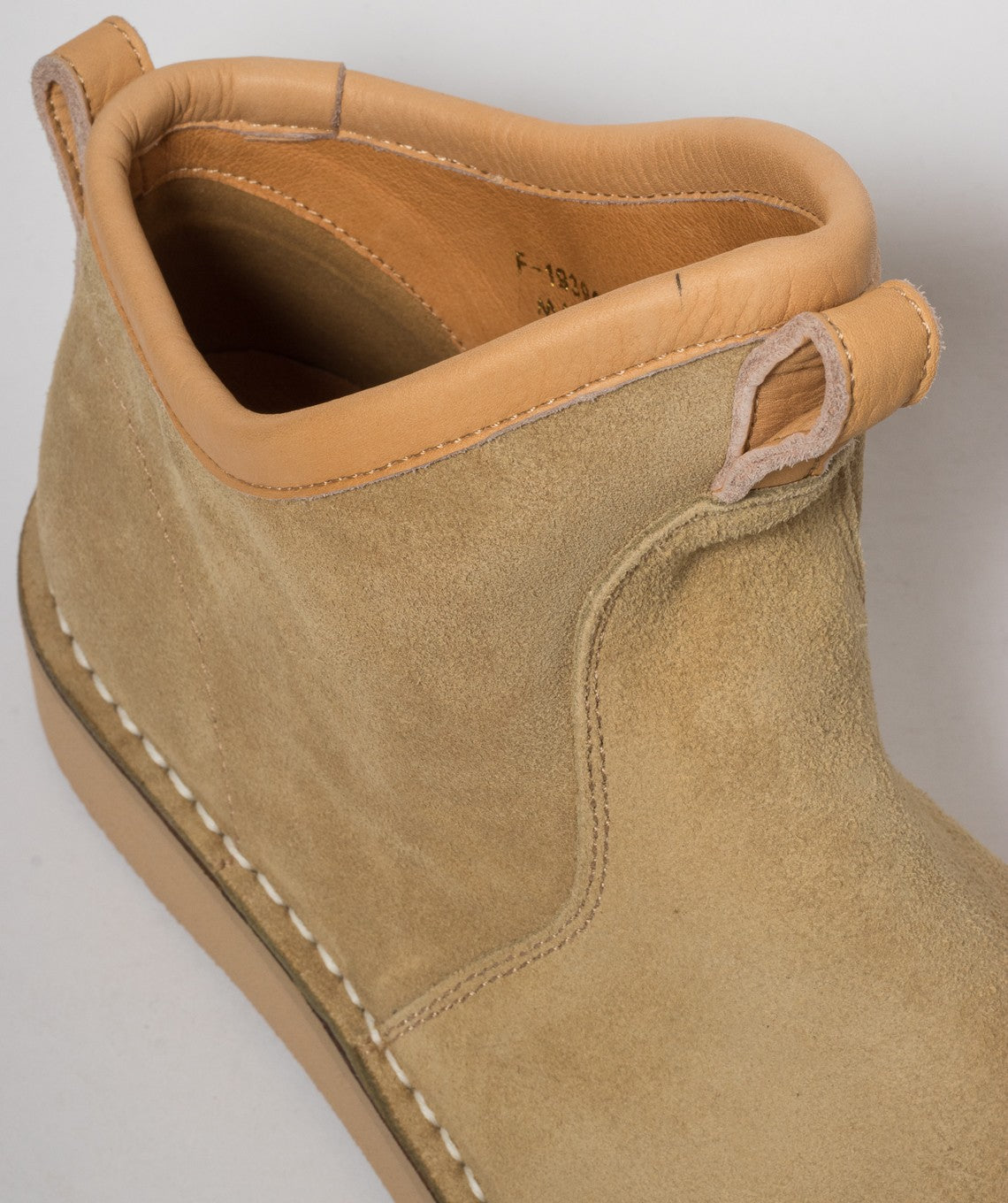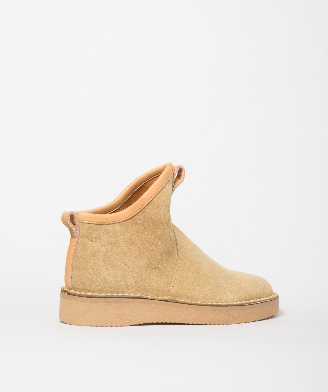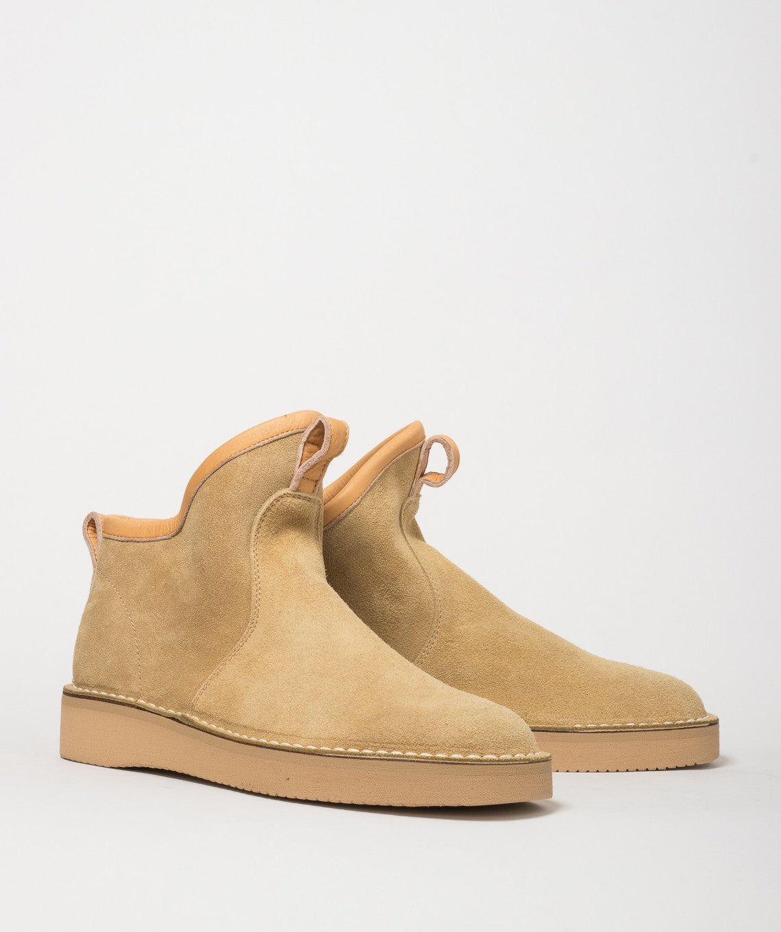 Beige suede mid-high boots made by Takashi Kanokogi. Minimal design, easy to wear.