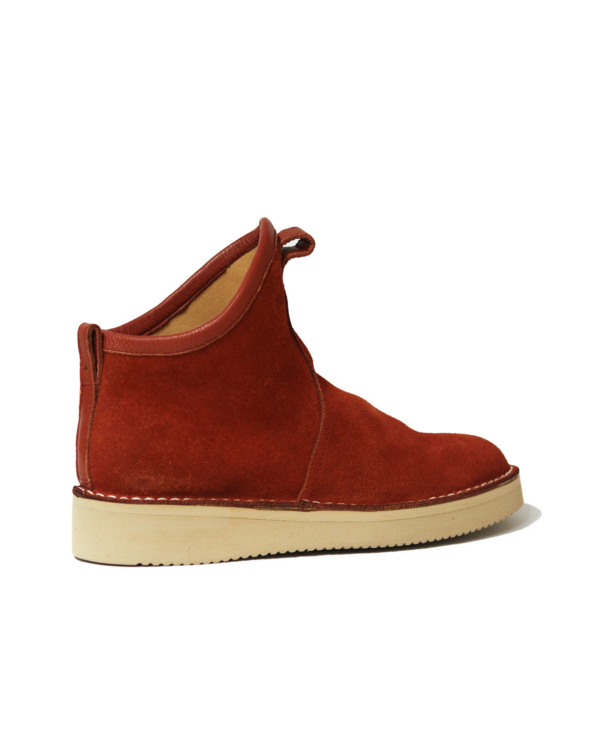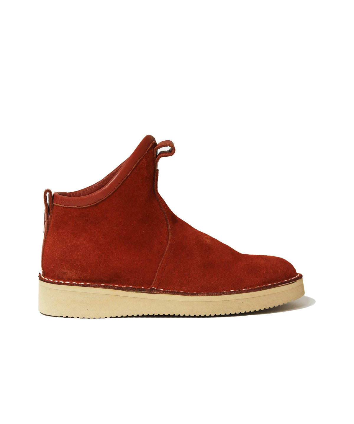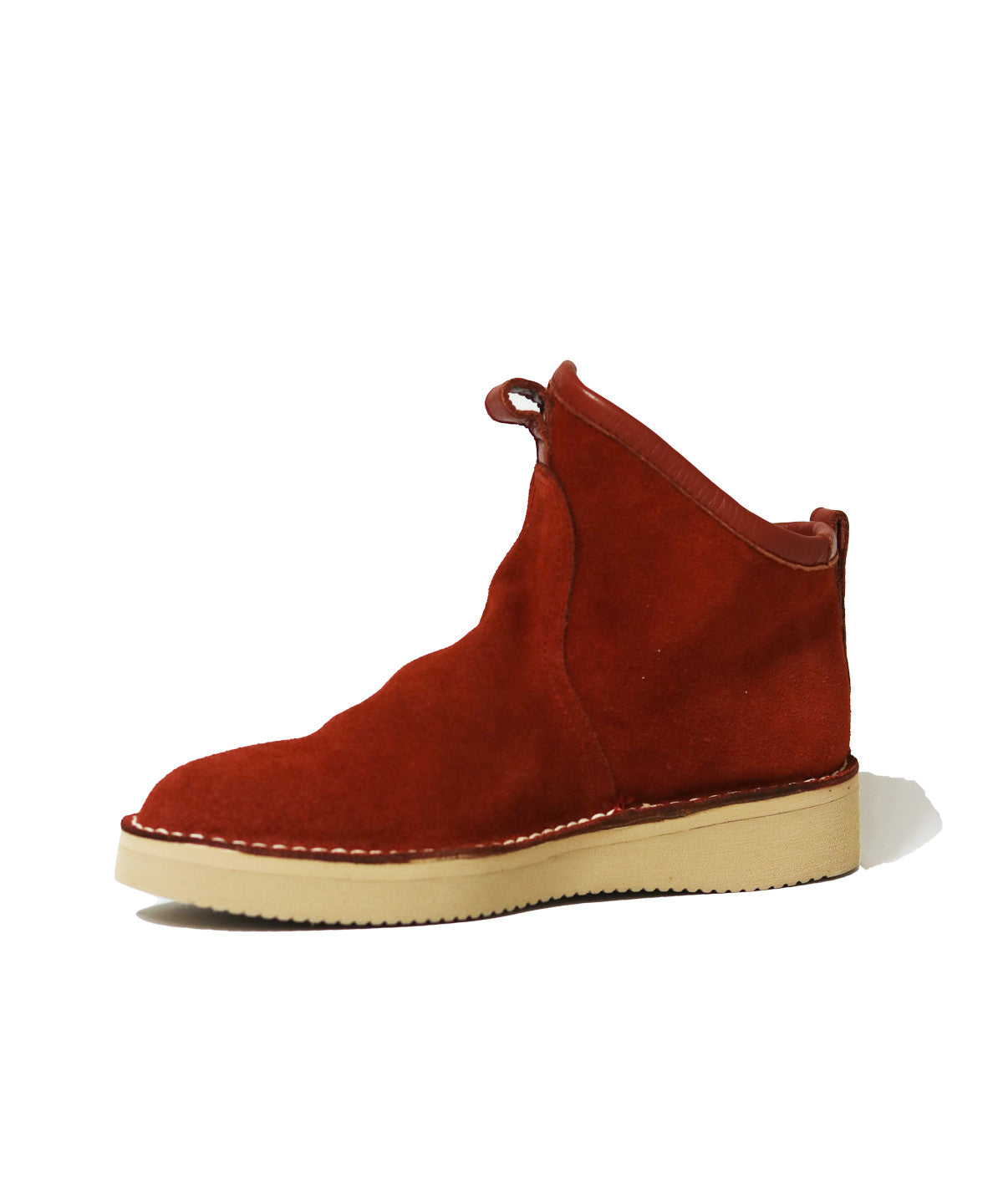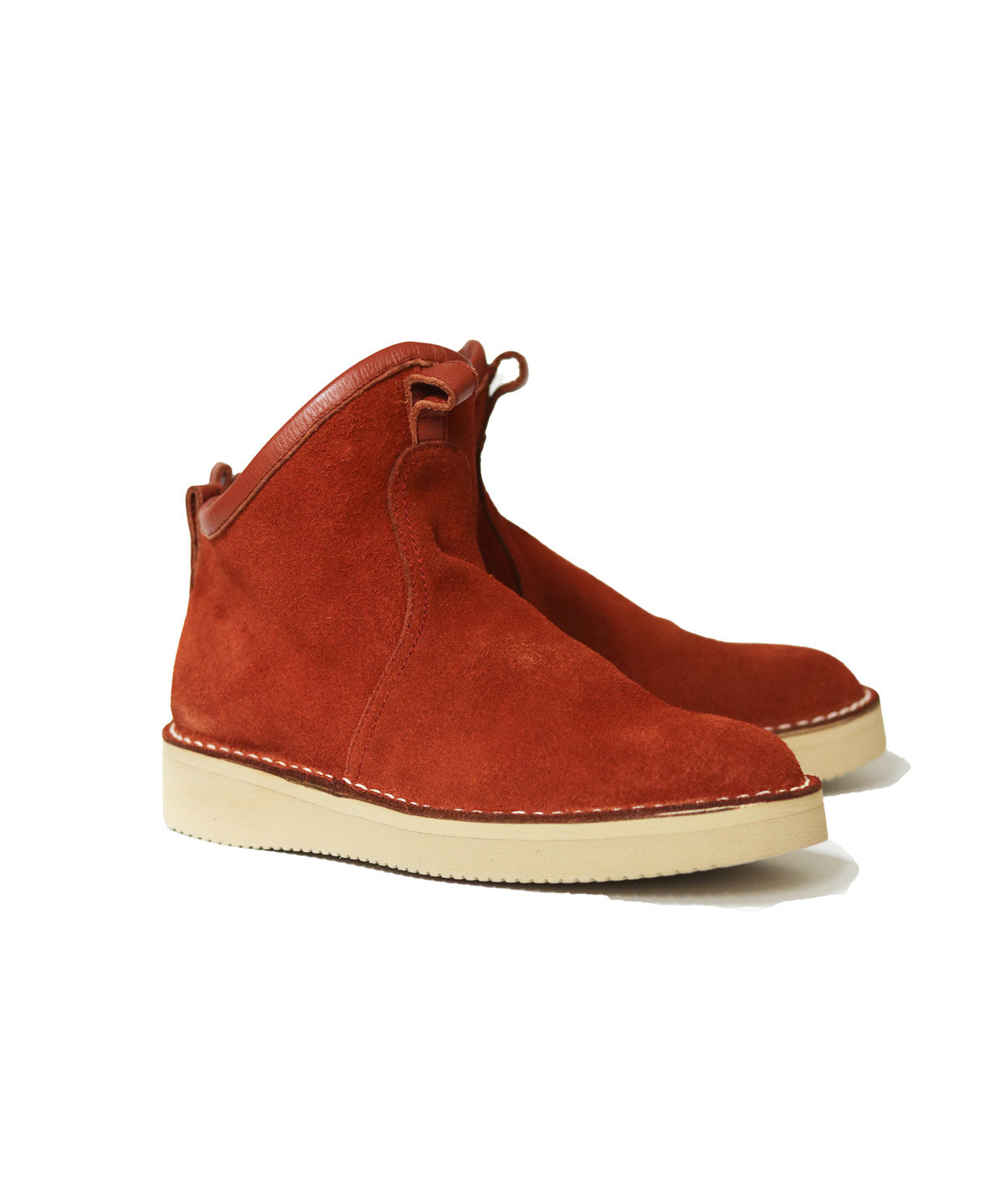 Mid-high boots in terracotta suede made by Takashi Kanokogi. Minimal design, easy to wear.