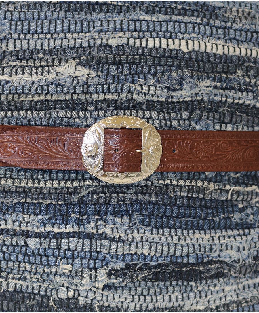 Ceinture western artisanale en cuir véritable, inspirée du style vintage des années 1930. La ceinture est gravée du motif traditionnel d'ACE.