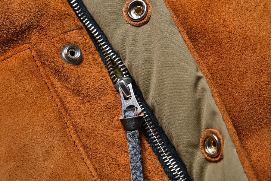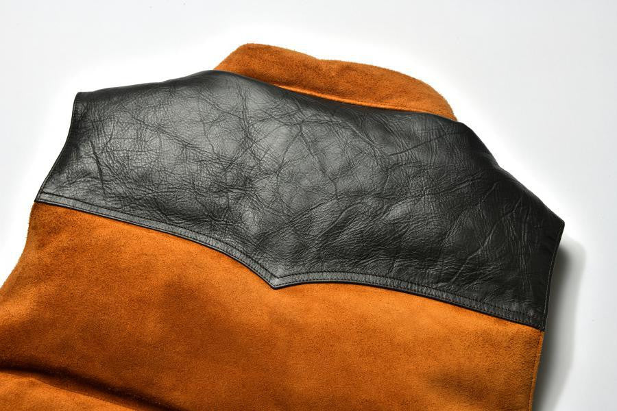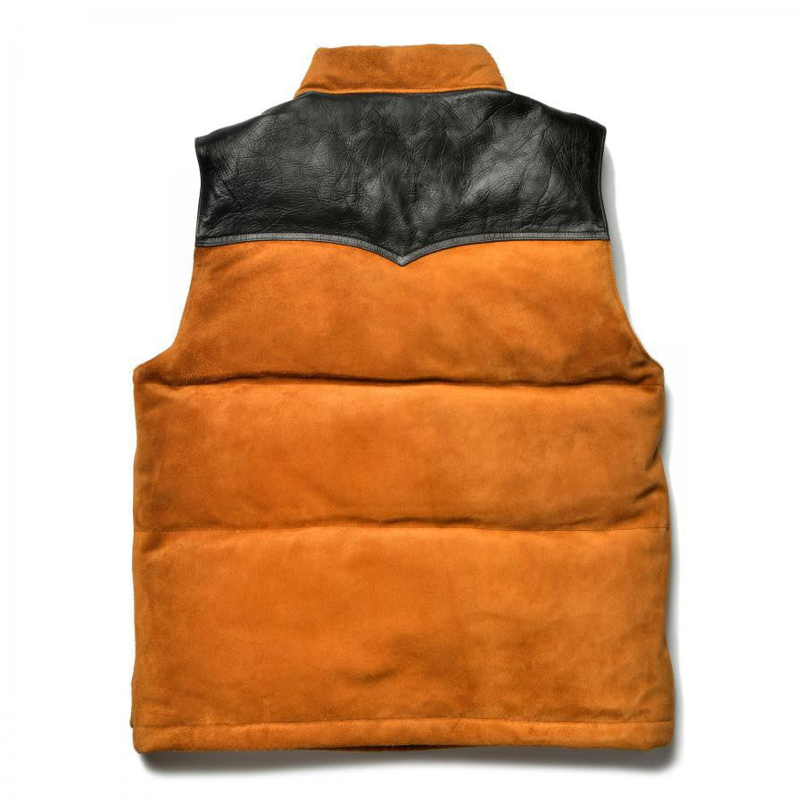 Depuis les années 1960, divers matériaux ont été utilisés pour les gilets en duvet. Pour ce produit du cuir de vachette à été utilisé sur la surface extérieure.