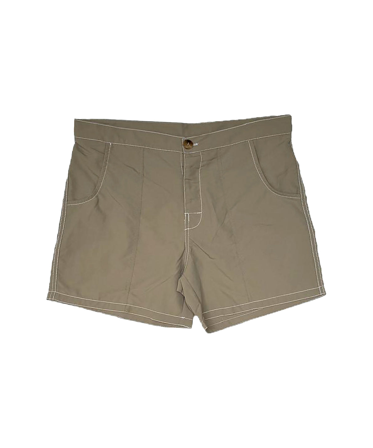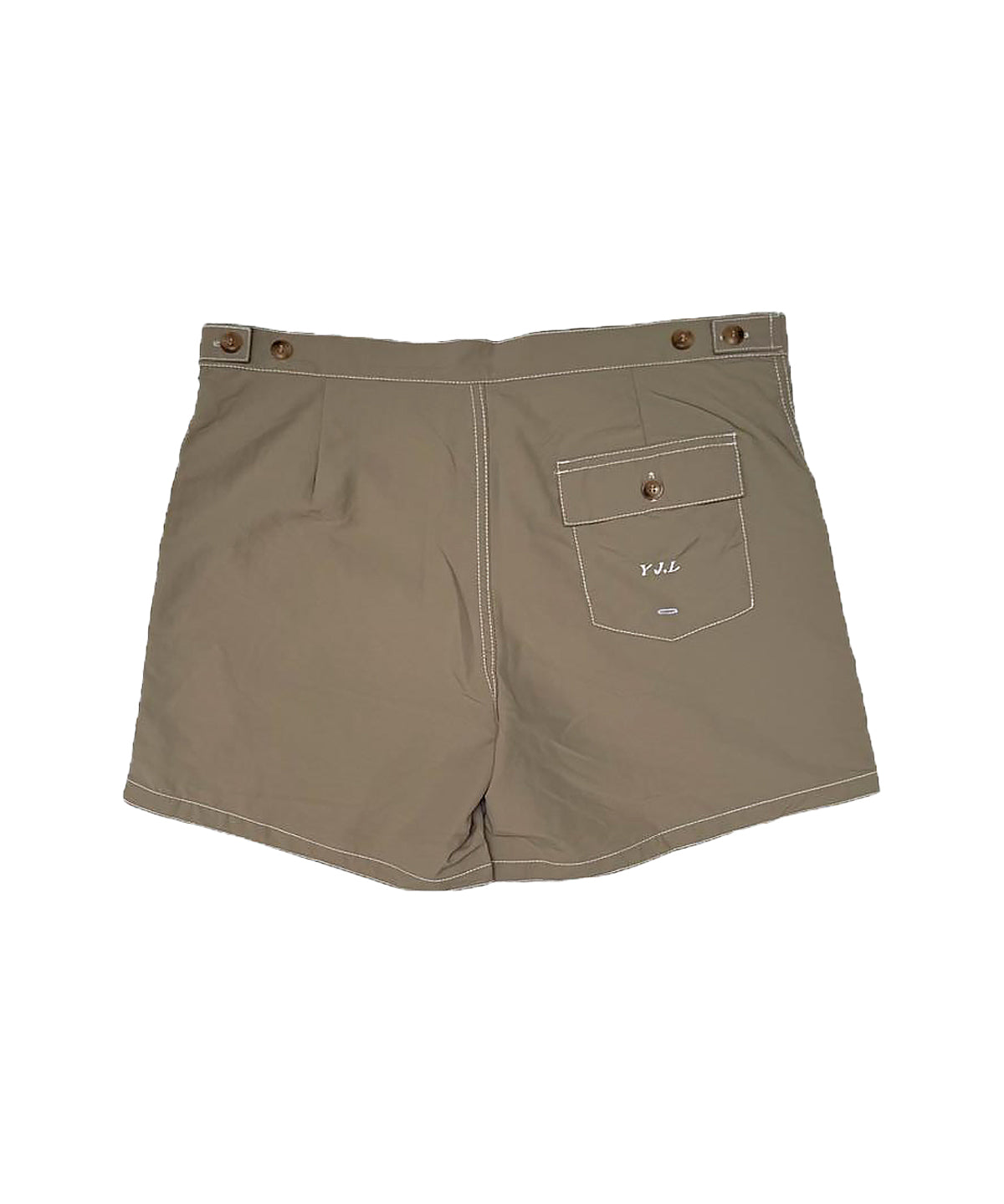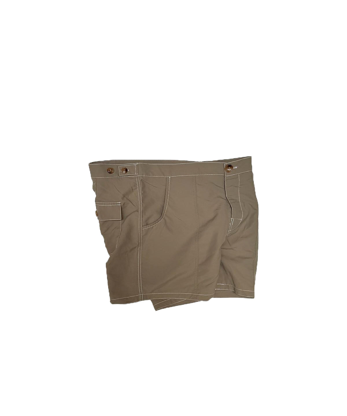 Inspiré de la coupe « fatigue pants », ce short de bain revisite un classique militaire avec une touche d’élégance japonaise. Confectionné en 100 % coton, il se distingue par ses deux poches plaquées à l’avant, sa poche arrière discrète et ses patellettes latérales permettant d’ajuster la taille selon vos envies.