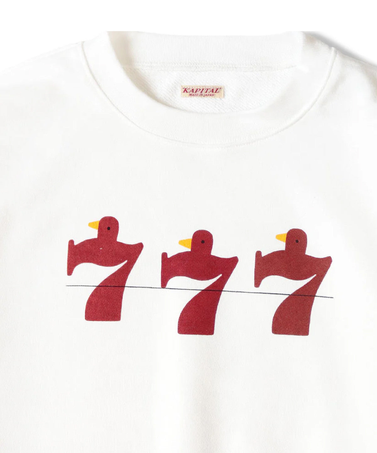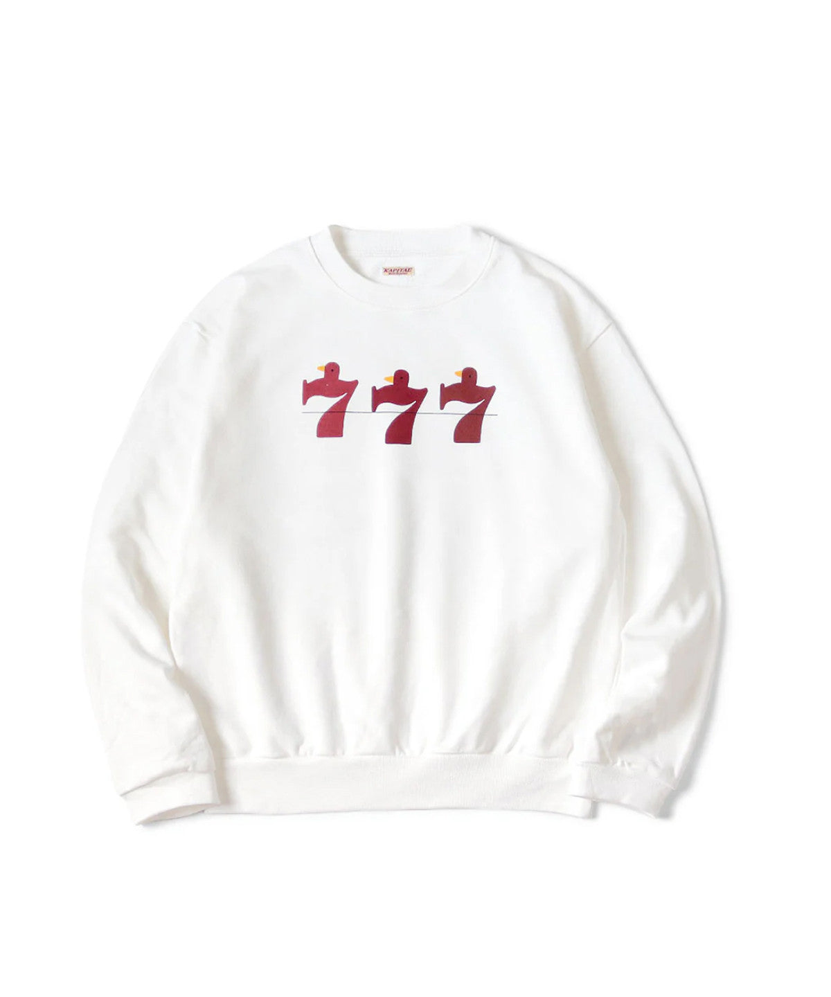 Sweat-shirt ras du cou blanc en tissu inversé. Il est orné d'un oiseau imprimé dans le style d'une machine à sous.